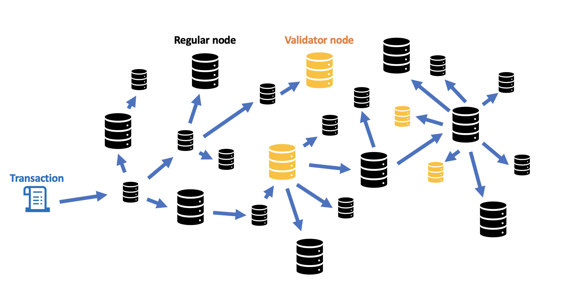 When a transaction is sent to a normal EVM node, it is propagated to all nodes within the blockchain network. It moves from node to node until a validator validates it or eventually reaches all nodes. Depending on network conditions, this process usually takes a few hundred milliseconds to a few seconds.